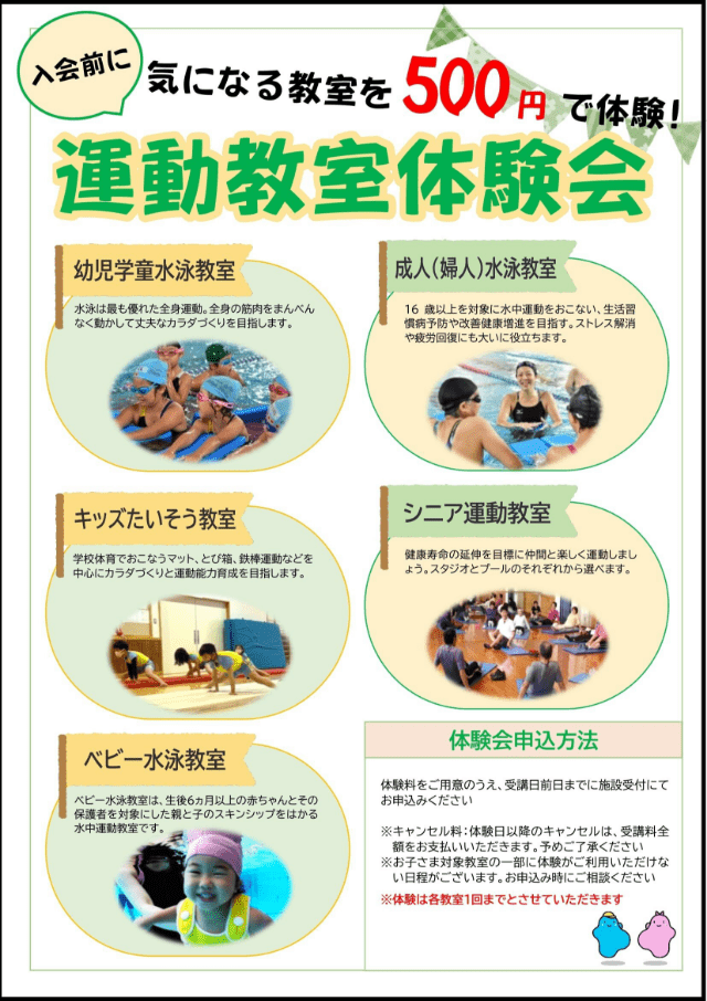 パンフレットダウンロード対象者・定員 申込期間 受講料 全年代 4/1㊋~2026年3/28㊏ 500円/回 各種プログラムを体験することができます!(各教室1回まで)